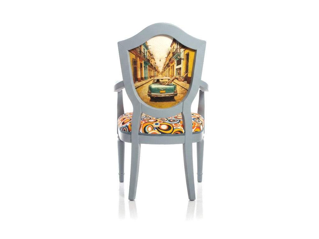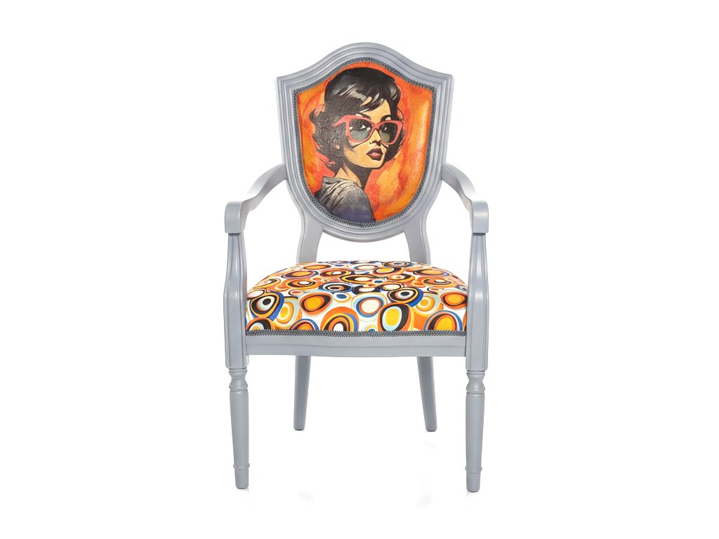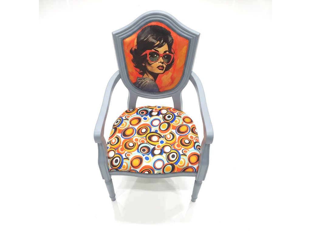 Na první pohled zaujme malovaným portrétem elegantní ženy s výrazem sebevědomé filmové ikony své doby. Na zadní straně židle pokračuje příběh – stejná žena odjíždí ulicí v klasickém americkém voze, zatímco jí ve větru vlaje šátek ve stejném vzoru, jaký se opakuje na látce na sedáku.