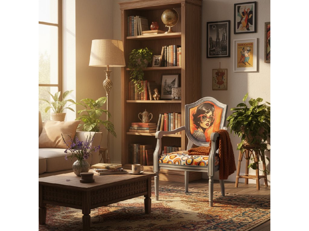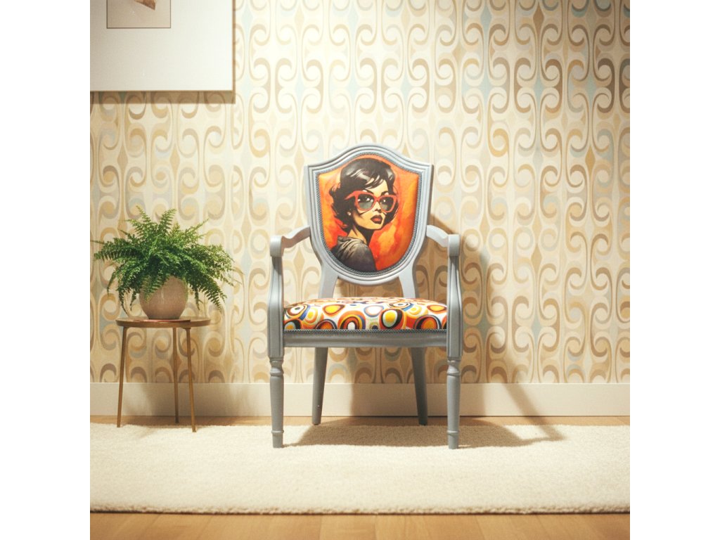 Židle byla původně klasickým vintage kusem, který prošel kompletní proměnou. Konstrukce dostala jemný modrošedý nátěr, jenž ladí s teplými tóny retro látky s kruhovým vzorem. Opěrka kombinuje techniku dekupáže a ruční malby, čímž vznikl jedinečný autorský motiv s uměleckým přesahem. Každý detail je dotažený – od přesného lemování po pečlivé ruční čalounění.