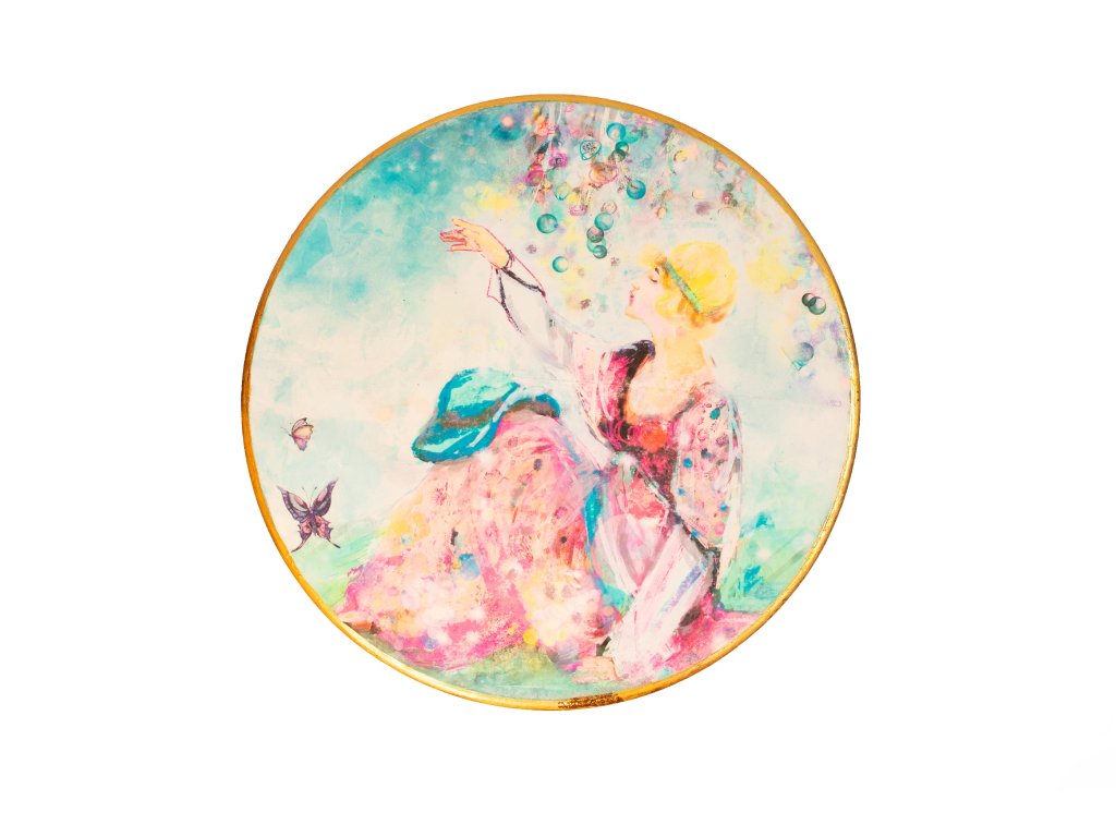 Horní deska je zdobená technikou decoupage, ručně domalovaná do jemných pastelových tónů růžové, tyrkysové a zlaté. Na motivu se objevuje éterická víla v rozkvetlé krajině, obklopená jarními květy a motýly, kteří jako by ožívali při dopadu světla.