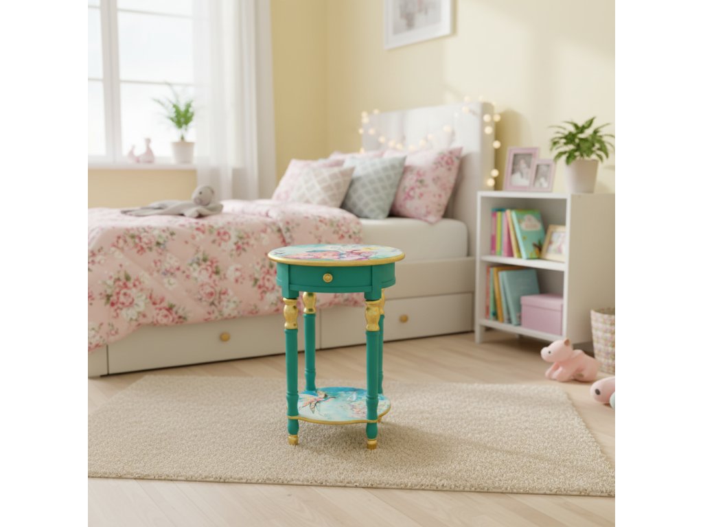 Ručně malovaný rám v tyrkysové barvě se zlatými detaily podtrhuje luxusní, přesto hravý charakter stolku. Malá zásuvka s decentní kovovou úchytkou dodává funkčnost i půvab.